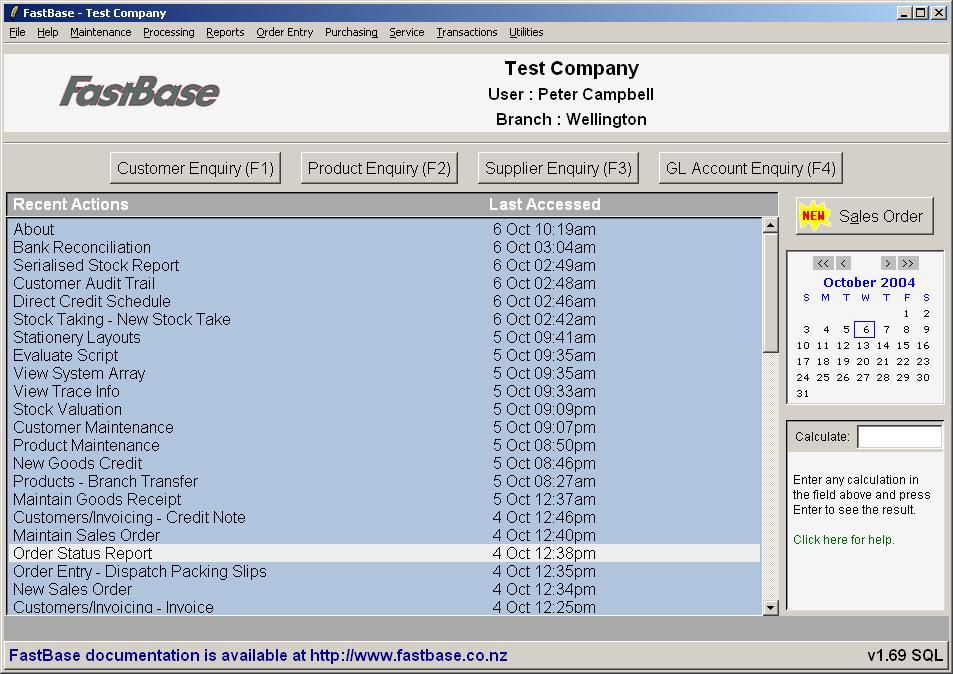 The main screen in FastBase will be displayed (see screenshot below). This consists of a series of menu options at the top, some buttons for accessing some enquiry functions and a list of recent actions.